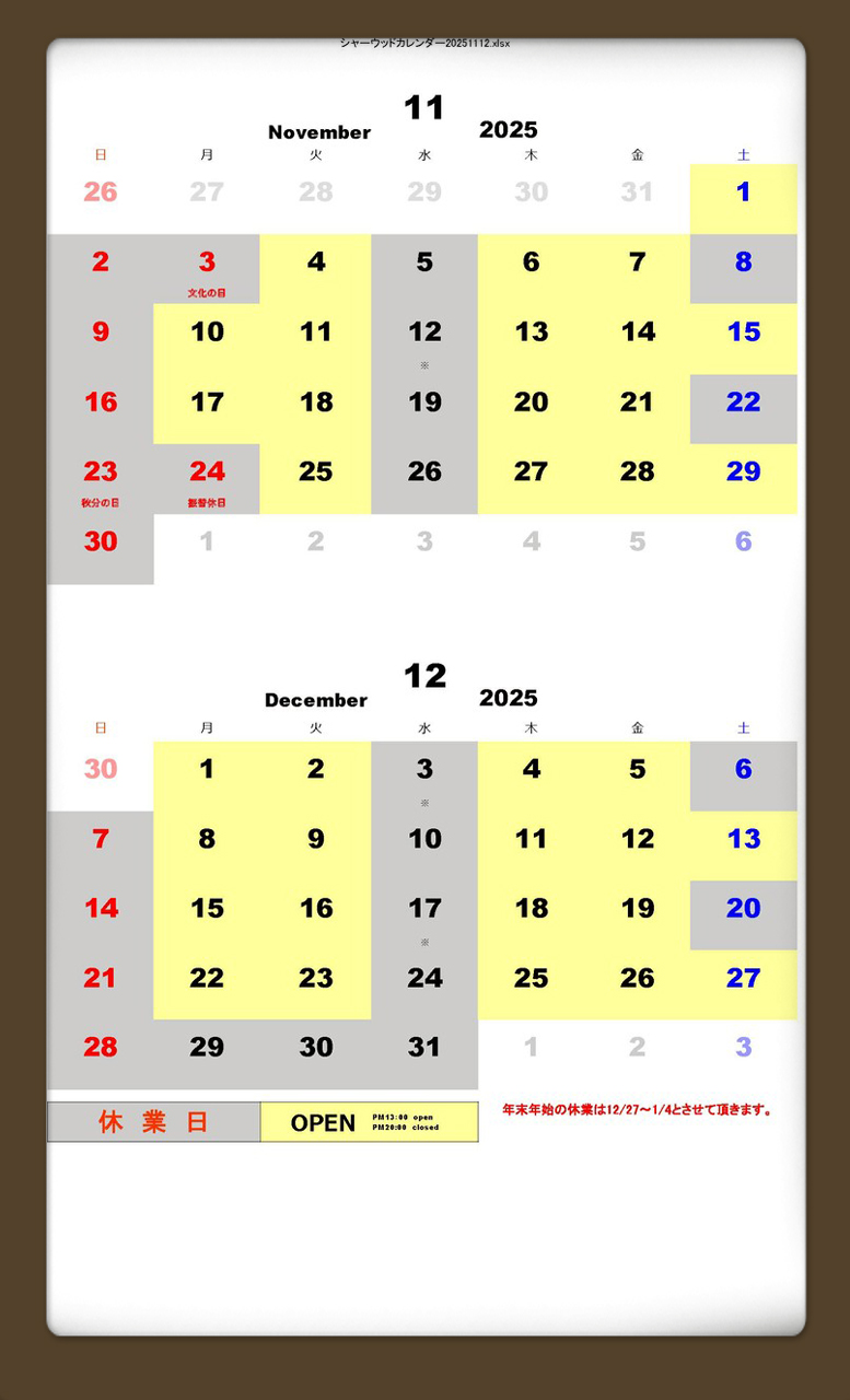 営業日 : 月曜日 ~ 火曜日 木曜日~土曜日 (イエロー) お休み : 水曜日、土曜日の一部、日曜日、祝祭日 (グレー) 営業時間 : 13:00 ~20:00